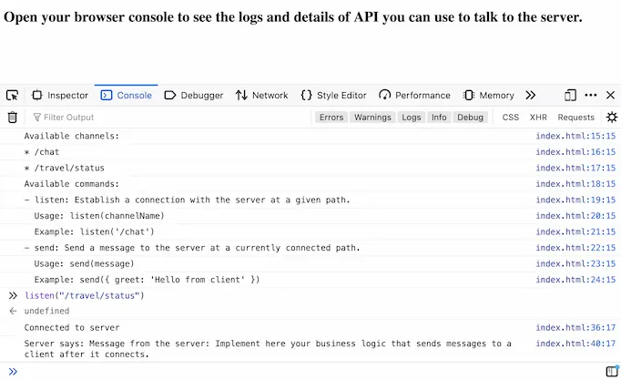 The index.html contains a simple API that you can call from the browser's console to talk to the WebSocket API. Open the file in the browser and play with the API: